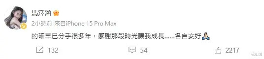 马泽涵在微博回应分手时,也表示“感谢那段时光让我成长……各自安好”。看得出来,她对这段感情还是心存感激的。